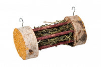 Holzrolle gefüllt mit Echinacea/Wegerich zum praktischen Einhängen im Käfig.