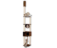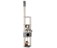 Die Platten und die Höhle sind mit Plüsch bezogen und bieten so bequeme Schlafplätze, während die Sisal-Kratzstämme für eine gute Möglichkeit zum Krallenschärfen sorgen. Die Röhre besteht komplett aus Plüsch. Durch den Deckenspanner kann der Kratzbaum Belmondo in Räumen mit 235 bis 265 cm Deckenhöhe aufgestellt werden.