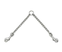 Die Hunde werden einfach, wie bei einer gewöhnlichen Leine, mit den Halsbändern an den Haken der Koppel befestigt. Durch den Ring, der die beiden Ketten miteinander verbindet, können Sie die gesamte Koppel dann nach Belieben an eine Leine oder Ansatzkette anschließen und so bequem mit mehreren Hunden einen Spaziergang machen, ohne die Kontrolle über die Tiere zu verlieren.