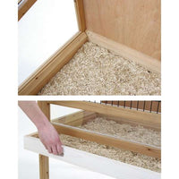 Die Reinigung des Käfigs ist durch die 6 cm hohe herausziehbare Kunststoffwanne und das aufklappbare Dach mit Fixierung ganz einfach. Damit nicht zu viel Einstreu aus dem Käfig herausfällt, sind die Umrandungen extra erhöht.