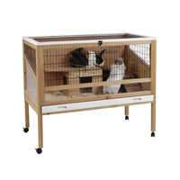 Der Korpus aus Massivholz mit Holzschutzlasur sieht nicht nur viel besser aus, als ein üblicher Käfig mit Kunstoffwanne und Gitter, sondern ist natürlich auch viel robuster und stabiler als ein solcher. Integrierte Plexiglas-Scheiben sorgen für mehr Licht und eine offene Sicht zum Tier.