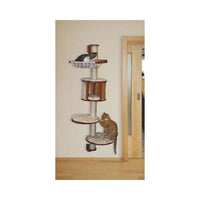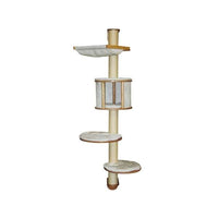 Die Liegeflächen des Kratzbaumes bestehen aus Holz und sind mit Plüschkissen ausgestattet. Das Sisal ist an den Säulen verklebt.