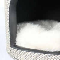 Die Höhle ist mit mehrfarbigem Flechtmaterial in dezenten Farben bezogen und passt dadurch in jede Wohnung. Das innere der Höhle ist mit Kunstleder ausgekleidet. Durch den stabilen, runden Metallfuß wird das zeitlose Design abgerundet.