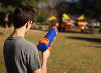 4. Den Tennis Ball Blaster NICHT auf Menschen, Tiere und Gegenstände richten. Eine Hand unter den Lauf und die andere auf den Griff legen. Den Lauf im 45-Grad-Winkel nach oben richten und vorsichtig den Auslöser drücken.