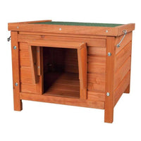 Es besteht aus lasiertem Kiefernholz und ist mit einem aufklappbaren Dach mit besandeter Dachpappe versehen. Seitliche Haken fixieren das Dach und verhindern so ein Aufklappen durch z.B. starken Wind. Die Beine schützen vor Bodenfeuchte und -kälte und sorgen gleichzeitig für eine gute Luftzirkulation unterhalb des Hauses.